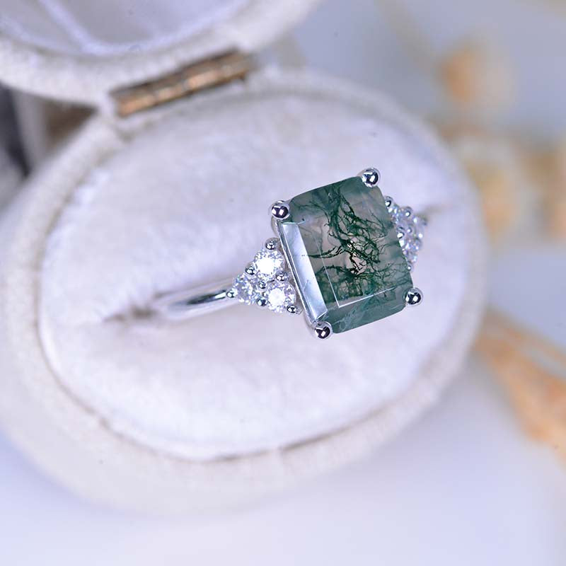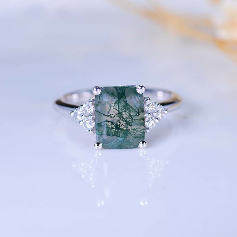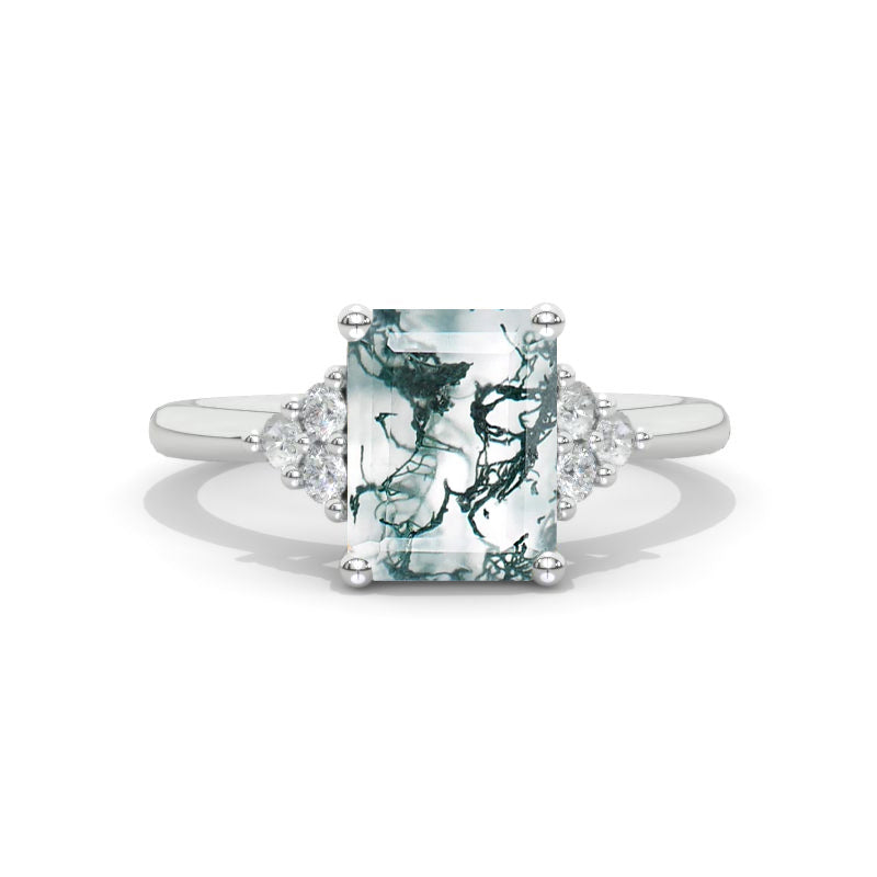 Emerald Cut 9x7mm with 2mm Sub stones Genuine Moss Agate White Gold En - Giliarto