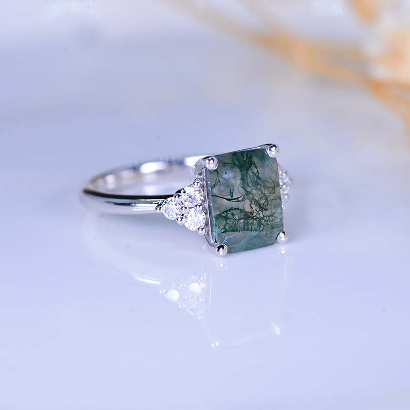 Emerald Cut 9x7mm with 2mm Sub stones Genuine Moss Agate White Gold Engagement Ring Model 577-9x7