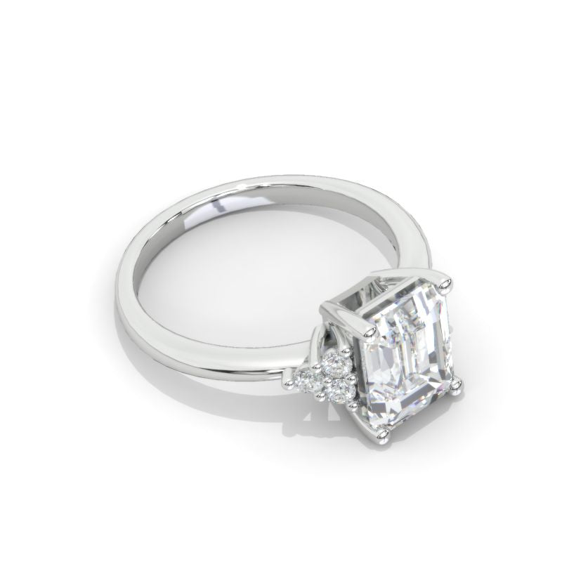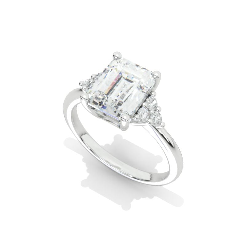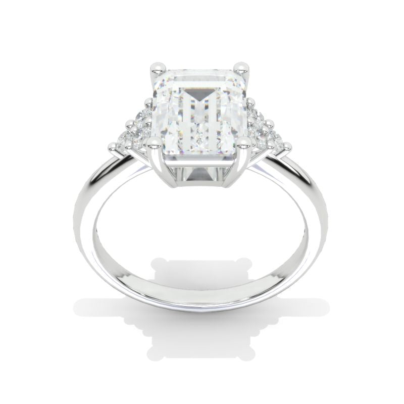 The default design option features 9x7mm Emerald Cut LAB-Grown Diamond Center StoneĀ D-Colorless VVS1-Clarity, VG-Cut, Ex-Polish, VG-Symmetry set with D- Colorless LAB-Grown DiamondĀ Accent StonesĀ