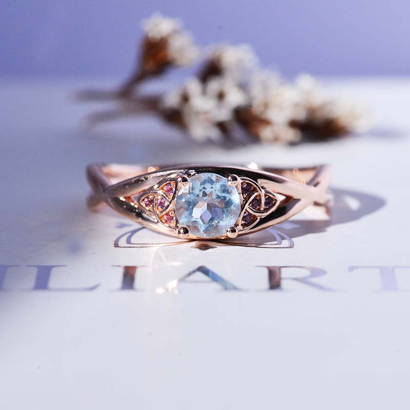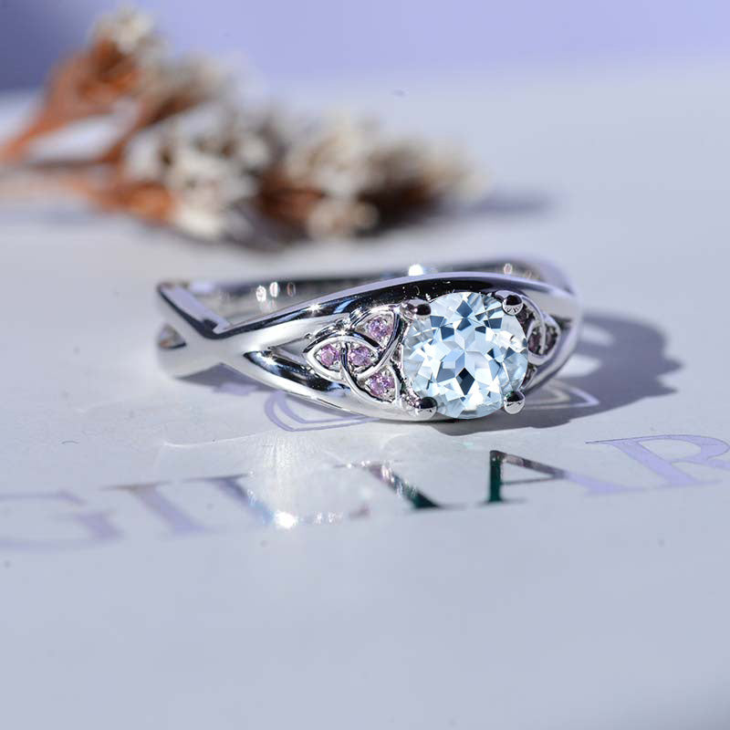 On the image featured Celtic Round Genuine Aquamarine 6mm AAA+ Quality, VG-Symmetry  with-0.1 CTW Amethyst accent stones 14K White Gold  Ring.