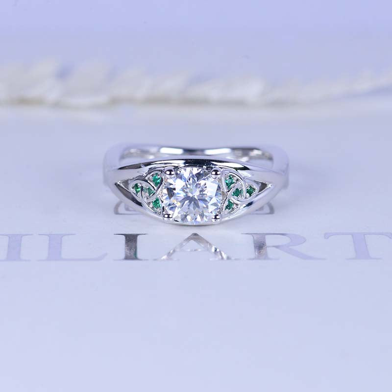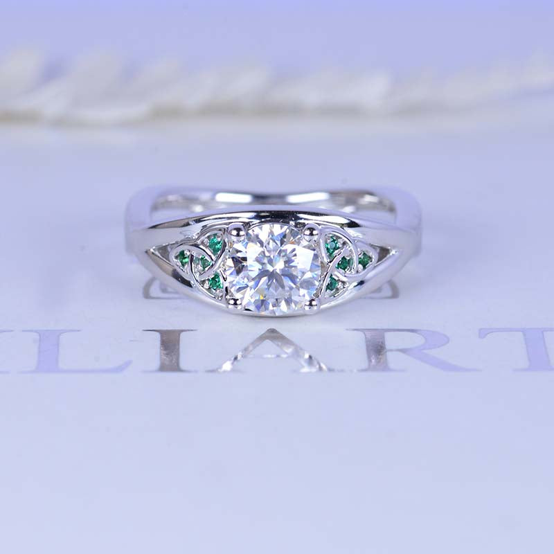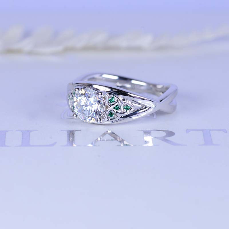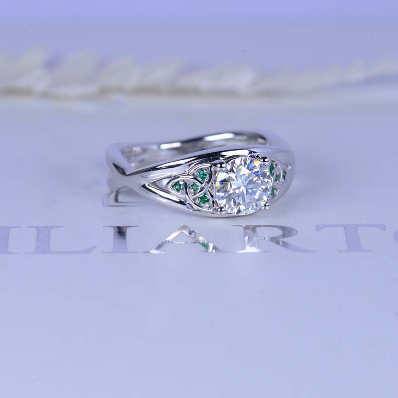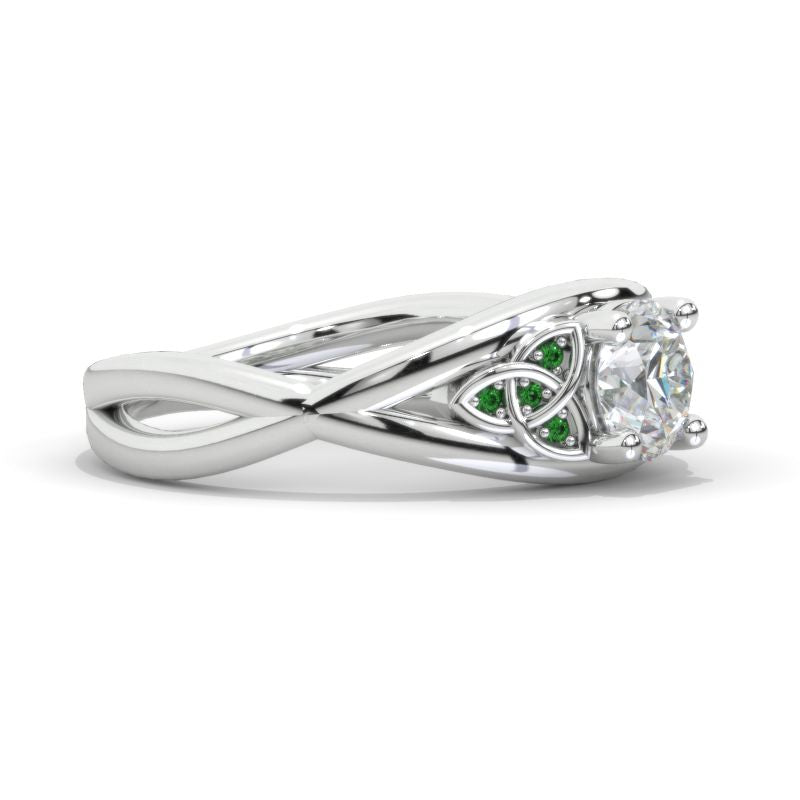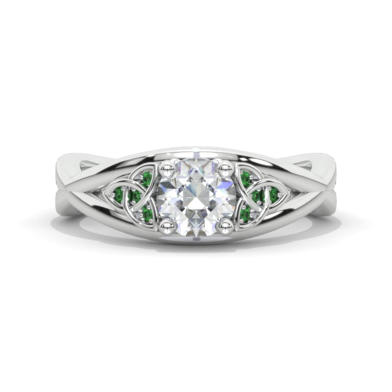 On the image featured Celtic Round LAB-Grown Diamond 6mm D-Colorless, VVS1-Clarity, VG-Symmetry with- Approximately 0.1+ CTW accent stones 14K White Gold Ring. Please remember that you can customize any design with your choice of metals and stones.