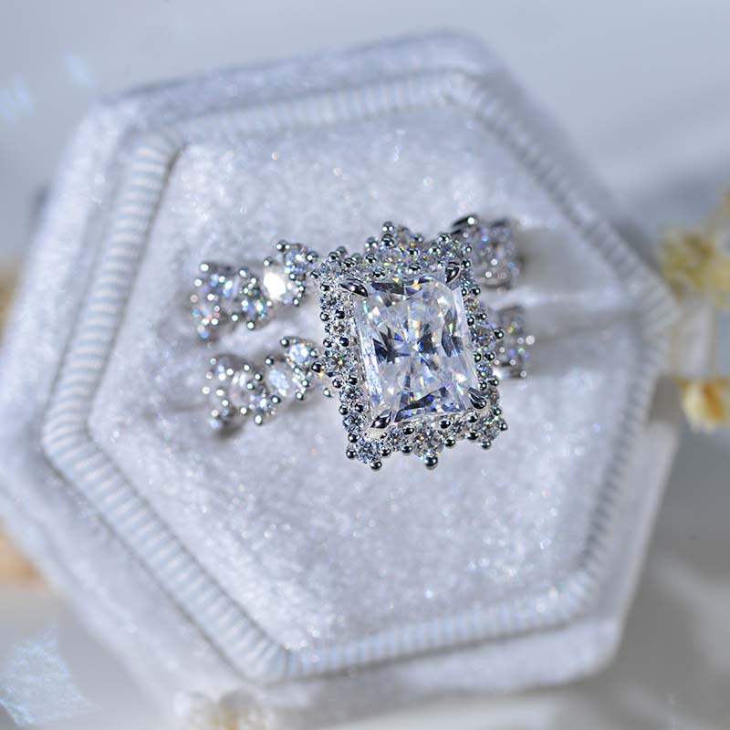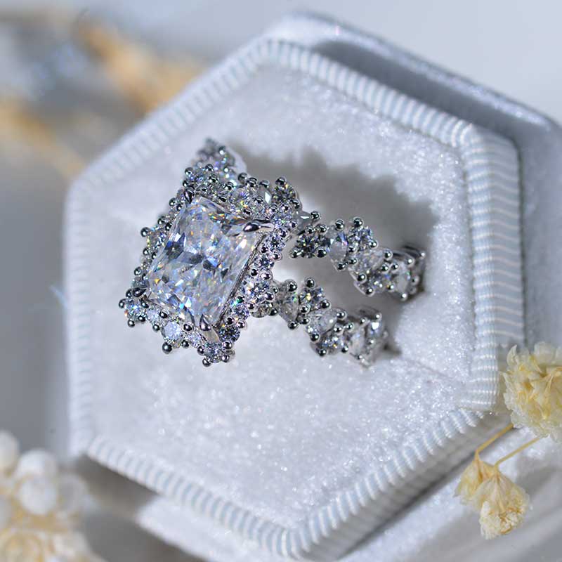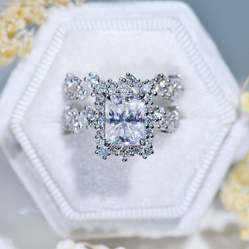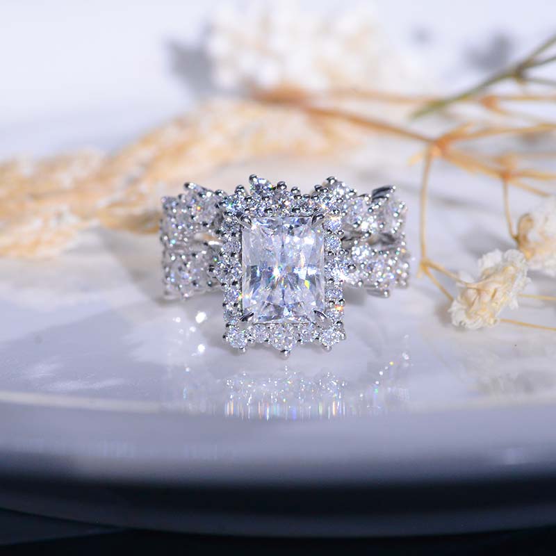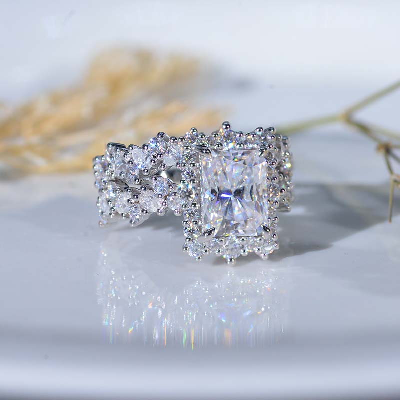 The default design option features 3 Carat 9x7mm Radiant Cut Giliarto Moissanite Center Stone set with 1.2 CTW Accent Stone: D-Colorless, VVS1-Clarity, VG-Cut, Ex-Polish, VG-Symmetry