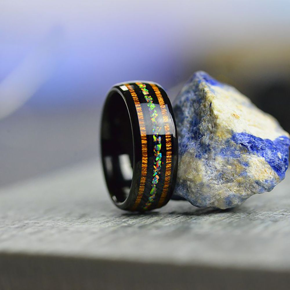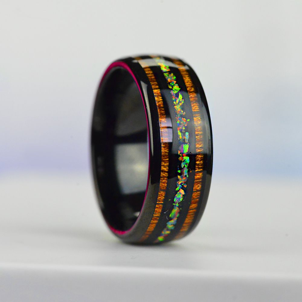 Natural Fire Opal Tungsten Wedding Ring with Hawaii Koa Wood For Him - Giliarto