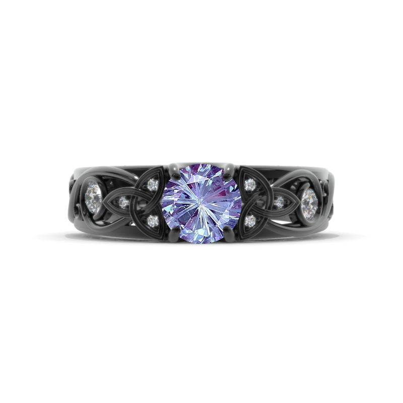On the image featured Celtic Round Fireworks Cut Ethically Lab-Grown Alexandrite 6mm, VG-Symmetry with Moissanite 10-0.25 CTW D-Colorless, VVS1 clarity accent stones 14K Black Gold Ring.