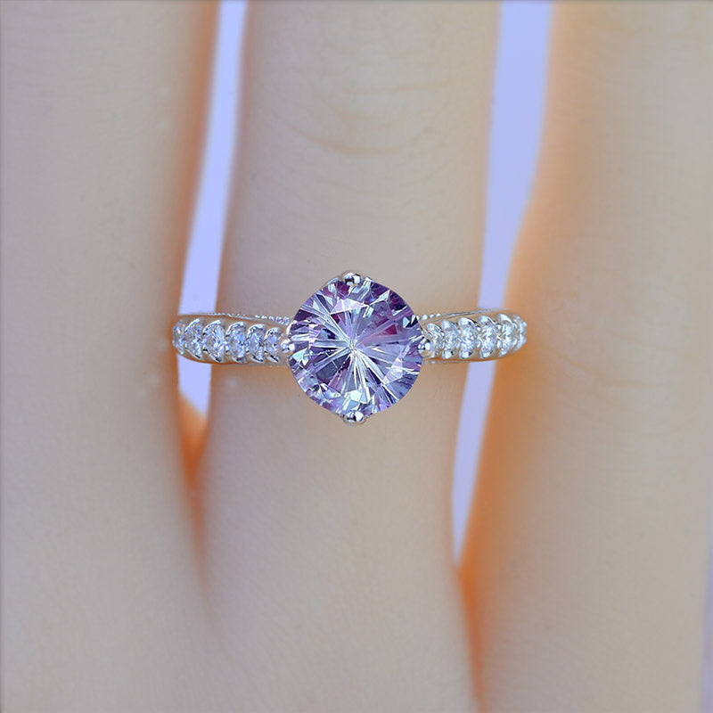 2 Carat Fireworks Cut Ethically LAB-Grown Alexandrite center stone (Ex-Cut, Ex-Polish, VG-Symmetry) and 16 Moissanite accent stones  (0.3 CTW D-Colorless, VVS1 clarity) with 14K white gold.