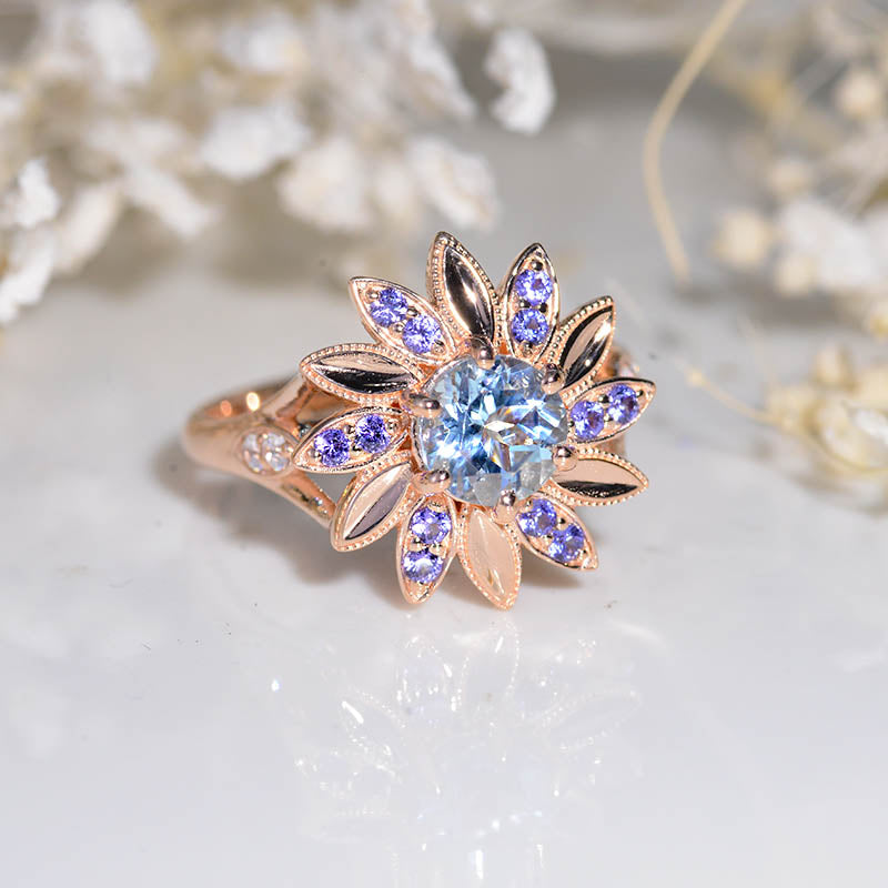 Floral Genuine Natural Aquamarine Sunflower Cluster Ring 14K Rose Gold Model 1127
