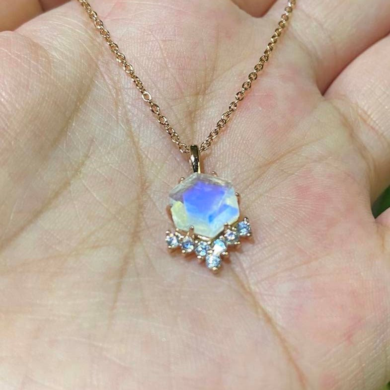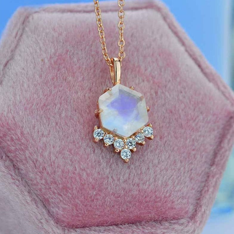 This Pendant decorated with high quality genuine 10x10mm Hexagon shape moonstone center stone in 14K rose gold setting, adjustable 16" or 18" cable chain.