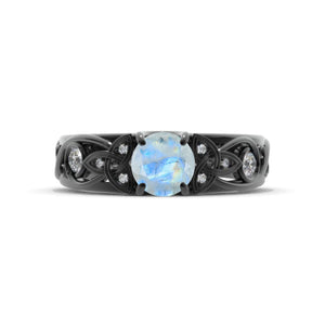 On the image featured Celtic Round Genuine Moonstone 6mm VVS1-Clarity, VG-Symmetry with Moissanite 10-0.25 CTW D-Colorless, VVS1 clarity accent stones 14K Black Gold Ring.