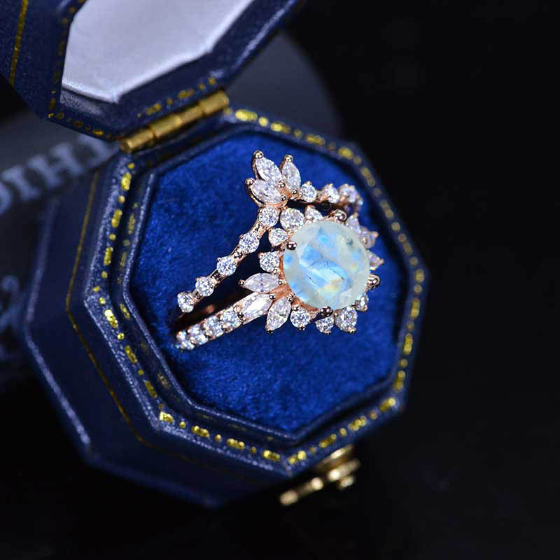 Genuine Moonstone Halo Engagement Ring Eternity Ring Set - Giliarto
