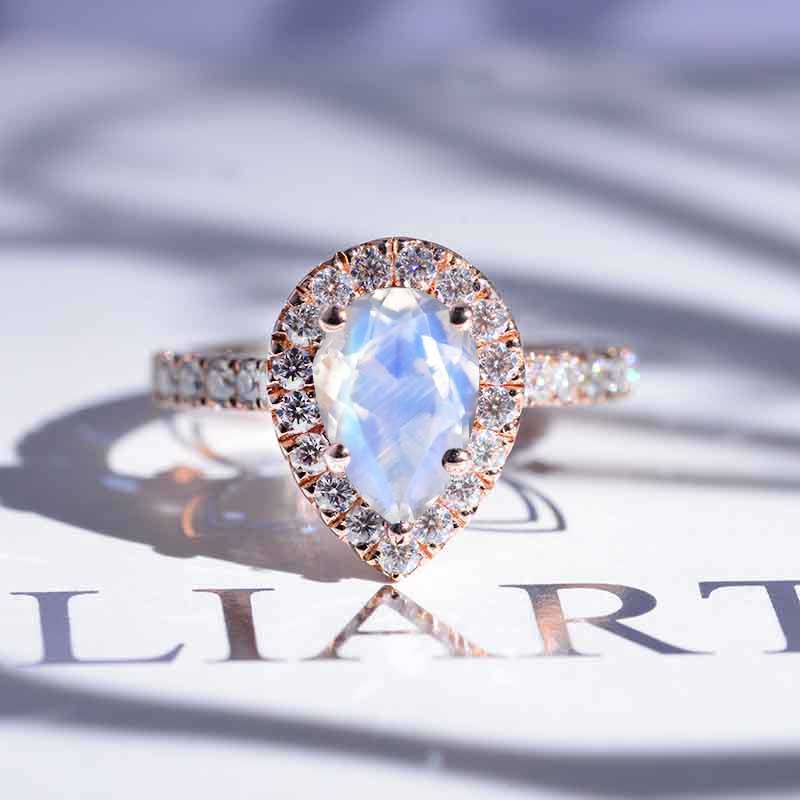 Genuine Moonstone Pear Cut Halo Moissanite Ring 14K Rose Gold Halo Rin - Giliarto
