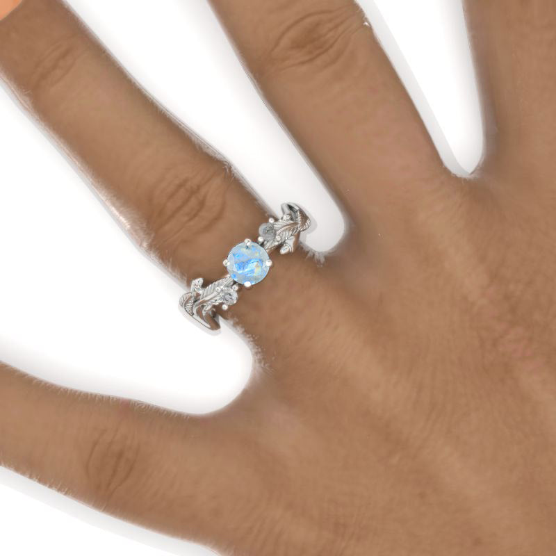 Genuine Moonstone White Gold Floral Engagement Leaves Ring
