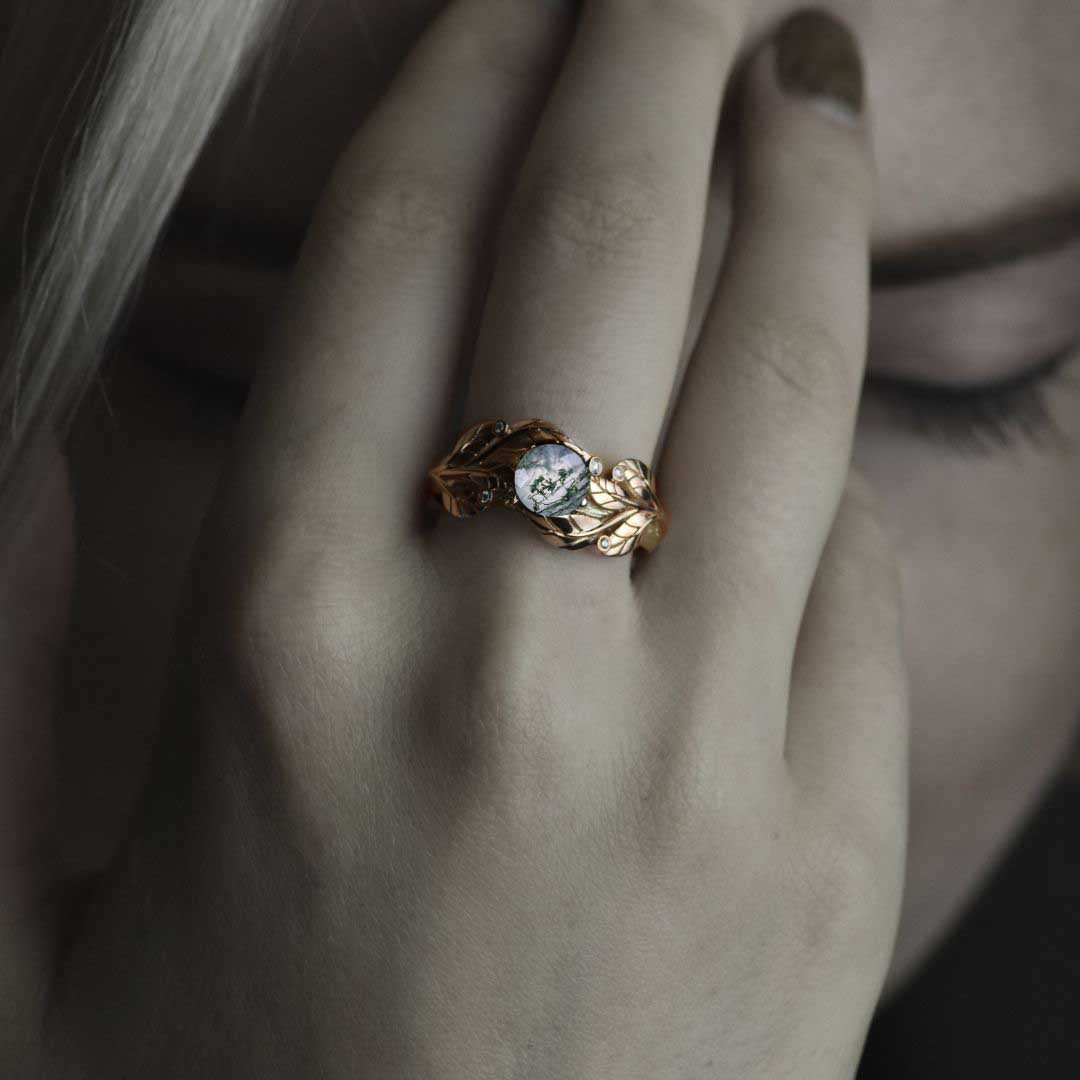 Genuine Moss Agate Engagement Ring 14K Rose and White Gold - Giliarto