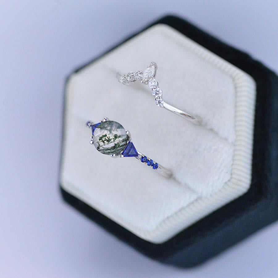 The default design option features 6mm RoundĀ  Genuine Moss AgateĀ Center StoneĀ