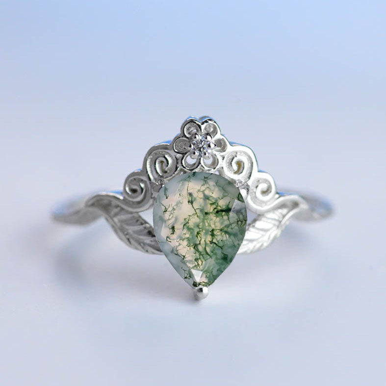 Genuine Moss Agate Pear Shape Floral Gold Ring - Giliarto