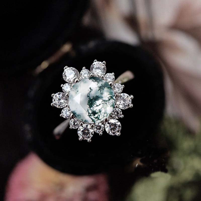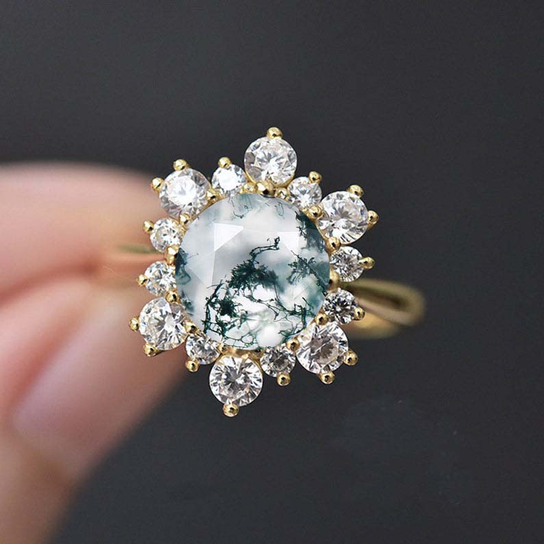 Genuine Moss Agate Ring/2.0ct Round Cut Moss Agate Halo Ring/Solid 14K - Giliarto