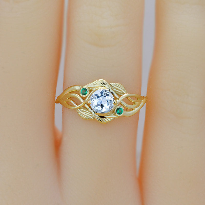 5mm Round Genuine Natural Aquamarine Center Stones Shape: Round, VG-Symmetry  with Emerald Accents Stones in 14K Yellow Gold.