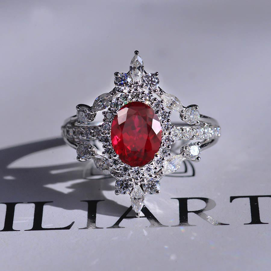 Engagement Ring : Ethically LAB Grown Ruby Oval 9x7 mm, VVS1-Clarity, VG-Cut, Ex-Polish, VG-Symmetry Center Stone with 48 Colorless 1.2 CTW Moissanite