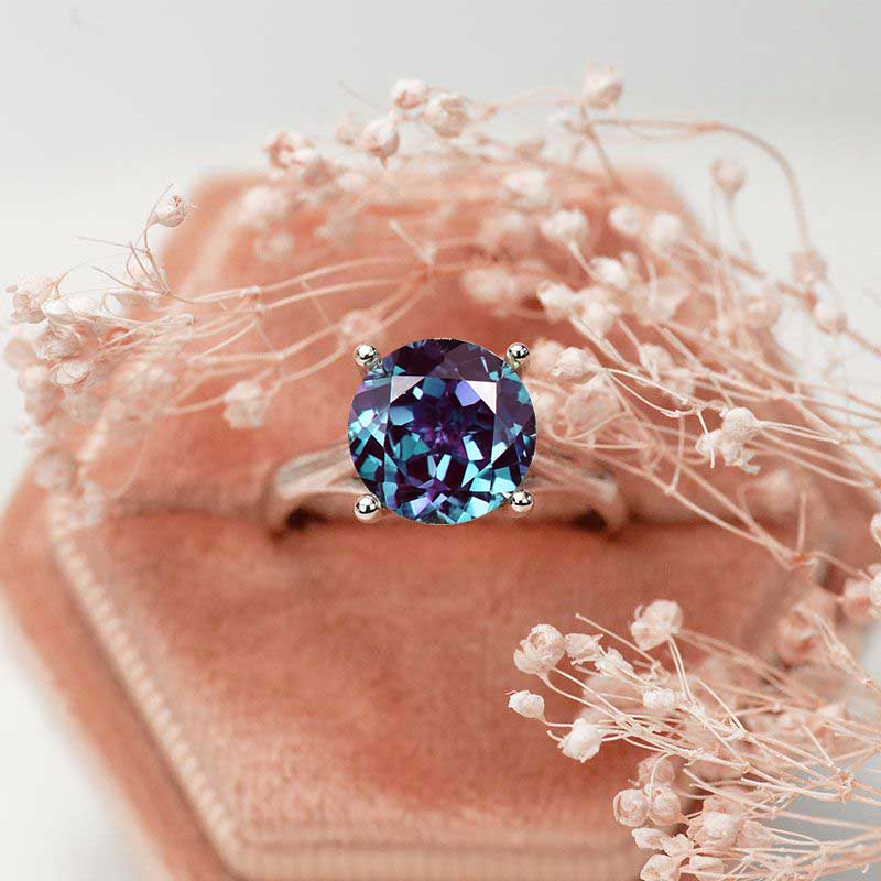 3.5 Carat Ethically Lab-Grown Alexandrite (Round 9 mm, Ex-Cut, Ex-Polish, VG-Symmetry)   in 14K White Gold  Ring.