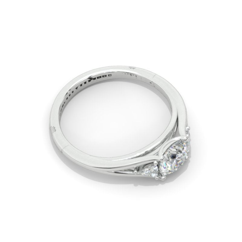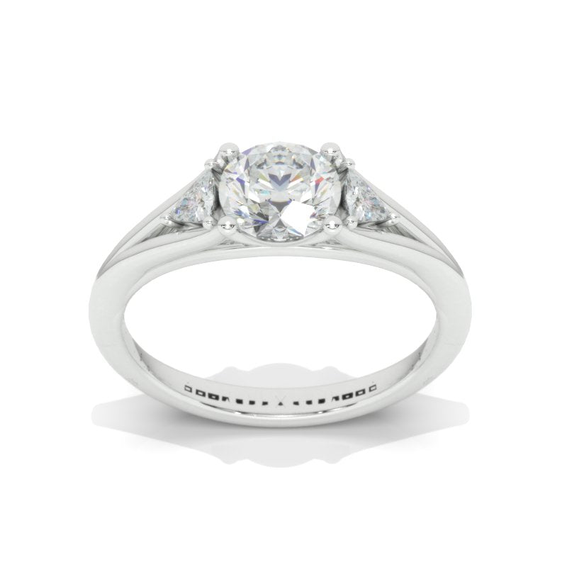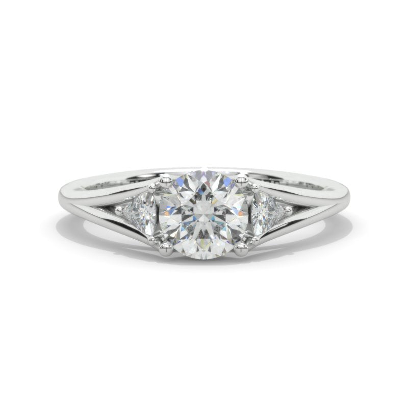 6mm Round Three Stone Giliarto Moissanite Center Stones Clarity: VVS1, D-Colorless: Shape: Round, VG-Symmetry with two 3x3mm trillion side stones in 14K White Gold.