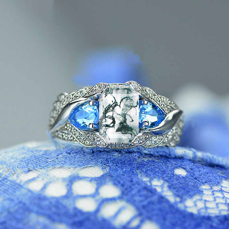 2.0 Carat Genuine Moss Agate 8x6mm Emerald Shape Step Cut Center Stone and two Pear 6x4mm 2x0.5 Carat with 62 - 0.3 CTW Moissanite (D-Colorless, VVS1 clarity) Accent Stones in