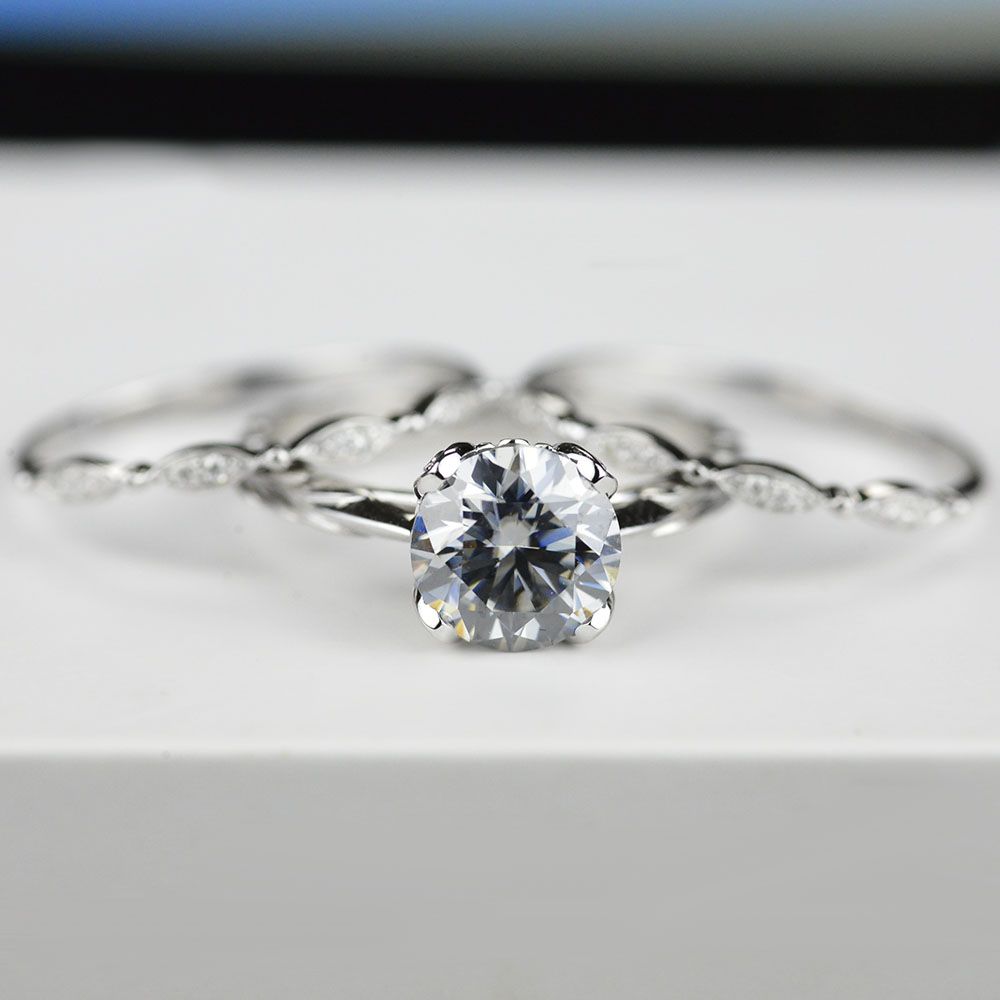 2.0 Carat Gray Color Moissanite Center Stone ( Round 8 mm, VVS1-Clarity, Ex-Cut, Ex-Polish, VG-Symmetry) with Two Eternity Bands in 14K White  Gold.