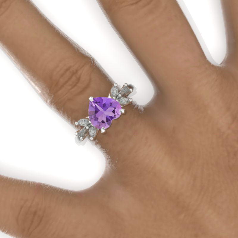 On the image featured 2 carat Heart Shape 8x8mm Genuine Natural Amethyst- AAAA Grade VG-Symmetry with  - 0.5 CTW  D-Colorless, VVS1 clarity moissanite accent stones and 14K white gold ring.