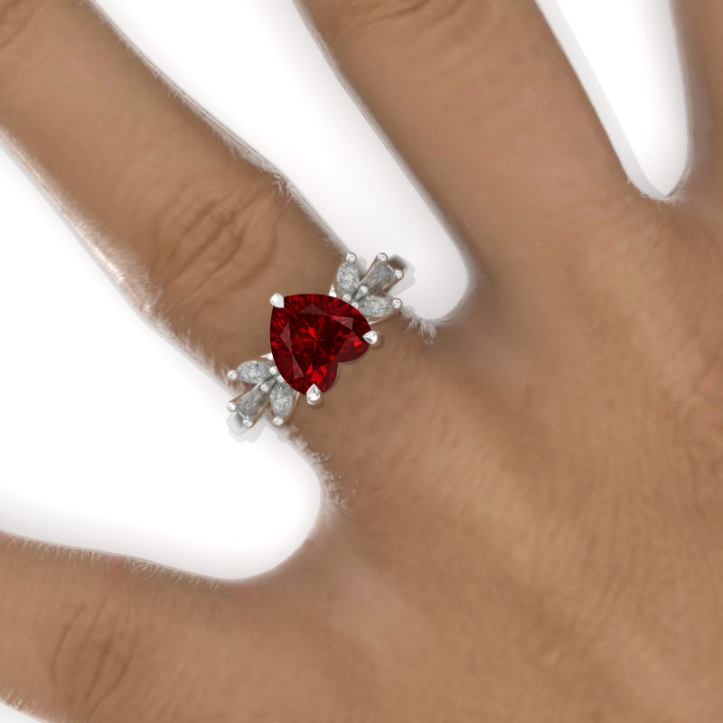 On the image featured 2 carat Heart Shape 8x8mm Ethically Lab-Grown Ruby AAA+ Grade (VG-Symmetry) with  - 0.5 CTW  D-Colorless, VVS1 clarity moissanite accent stones and 14K white gold ring. Model 849