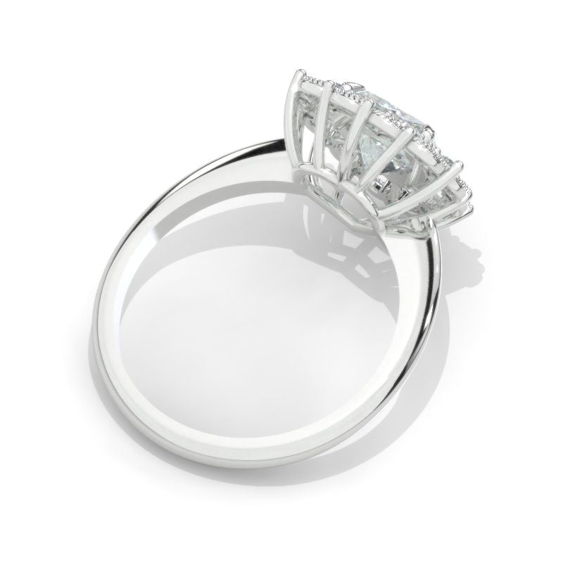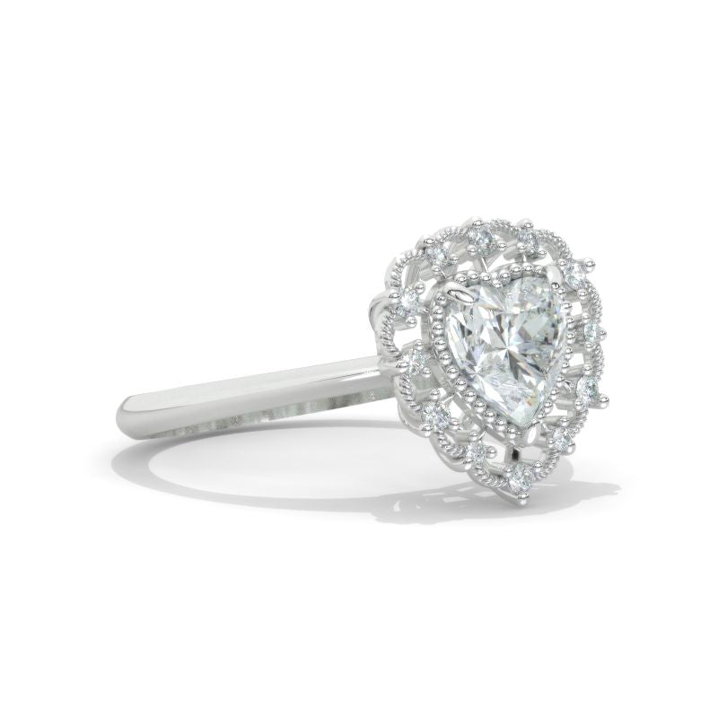 On the image featured 7x7mm Heart Shape LAB-Grown Diamond ( D-Colorless, VVS1-Clarity, VG-Symmetry) with Approximately 0.1+ CTW D-Colorless, VVS1 Clarity LAB-Grown Diamond Accent Stones and 14K White Gold Ring.