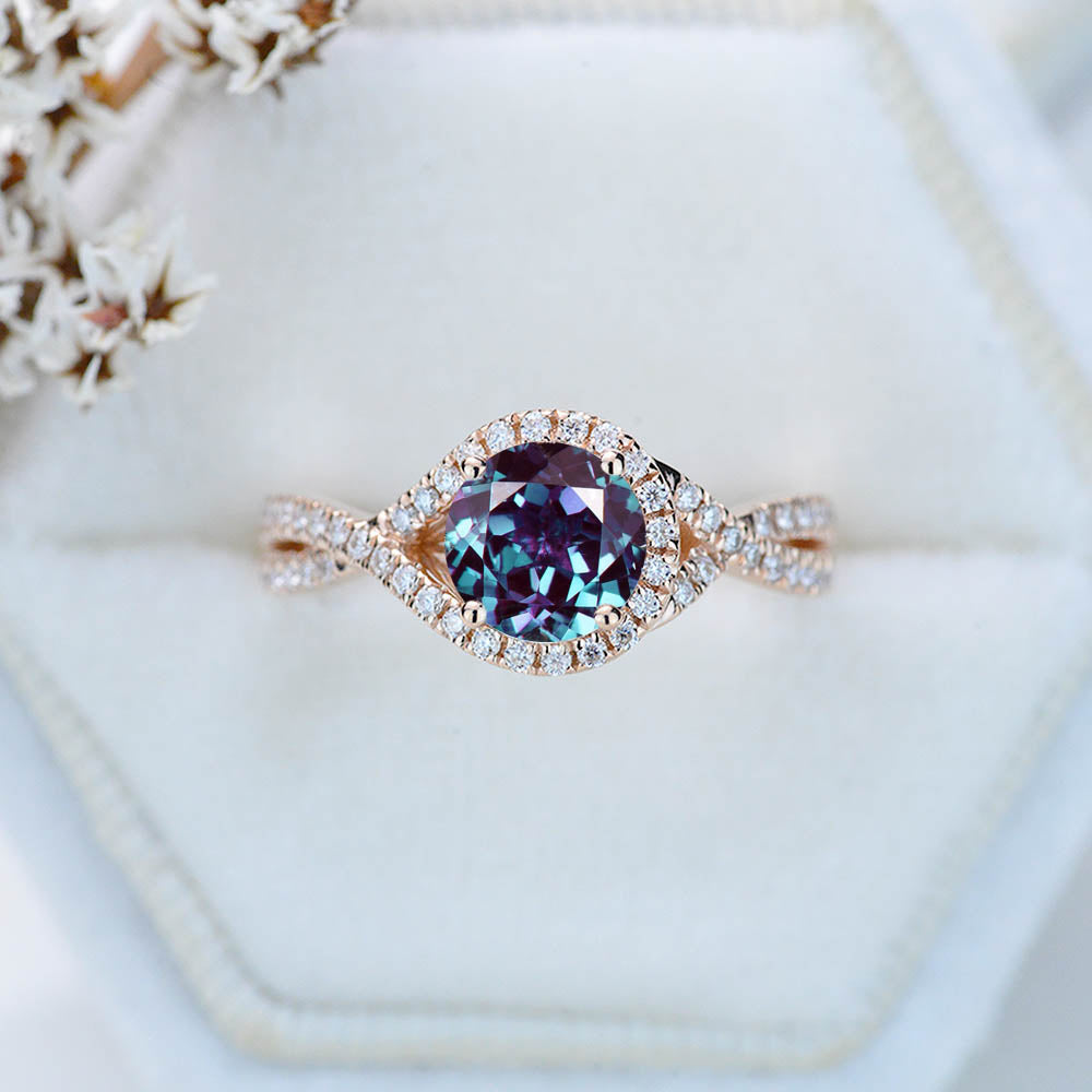 The default design option features 6.5mm Round Cut Ethically LAB-Grown Alexandrite StonesVVS1-Clarity, VG-Cut, Ex-Polish, VG-Symmetry