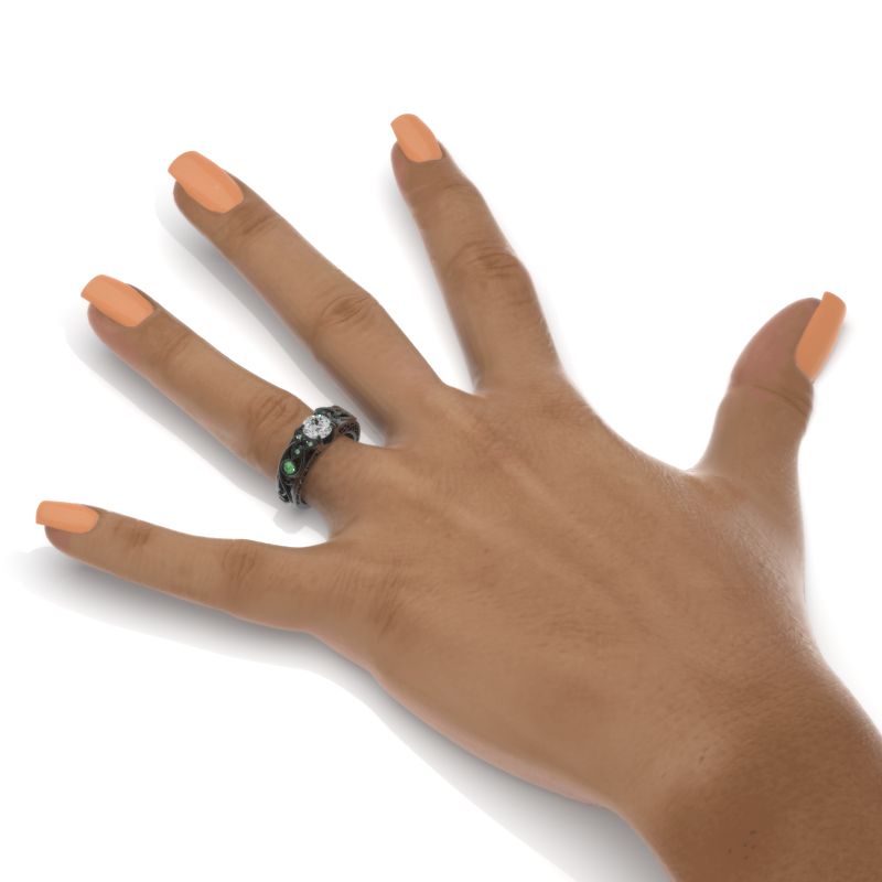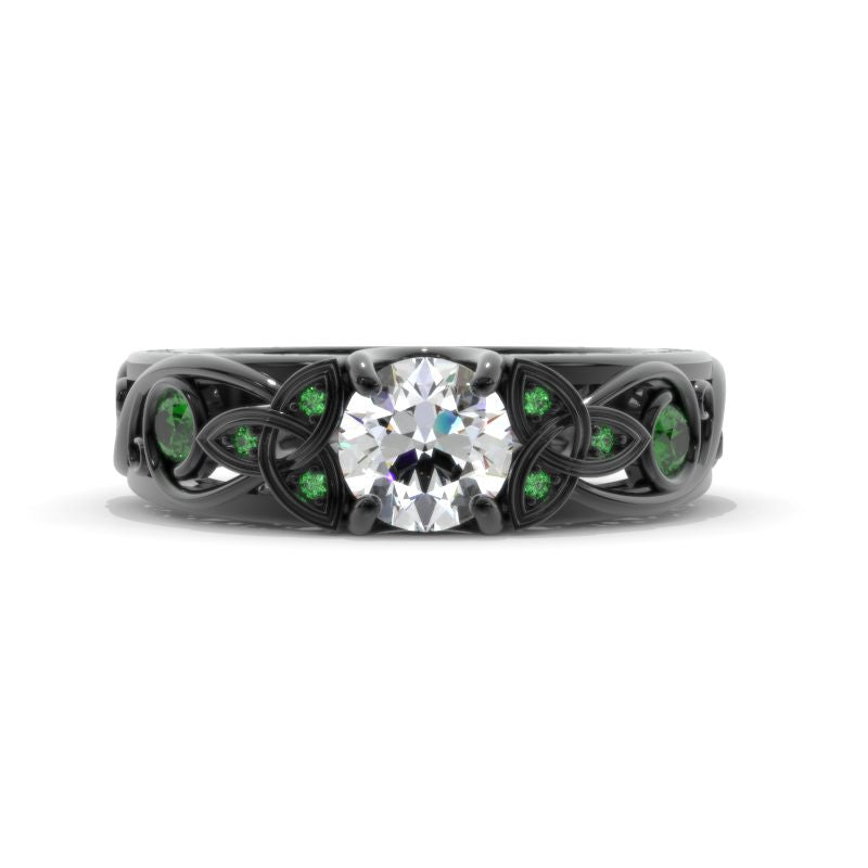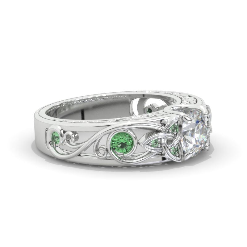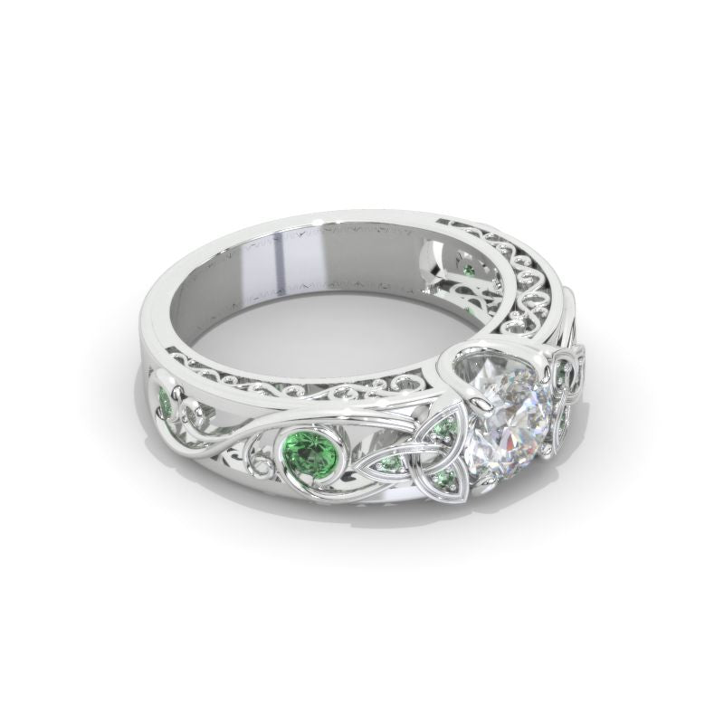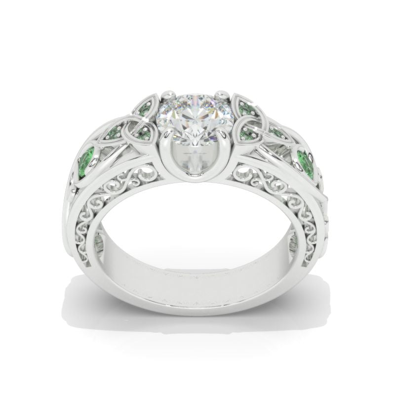 On the image featured Celtic Round LAB-Grown Diamond 6mm D-Colorless, VVS1-Clarity, VG-Symmetry with 10-0.25 CTW Lab-Grown Emerald accent stones 14K White Gold Ring.