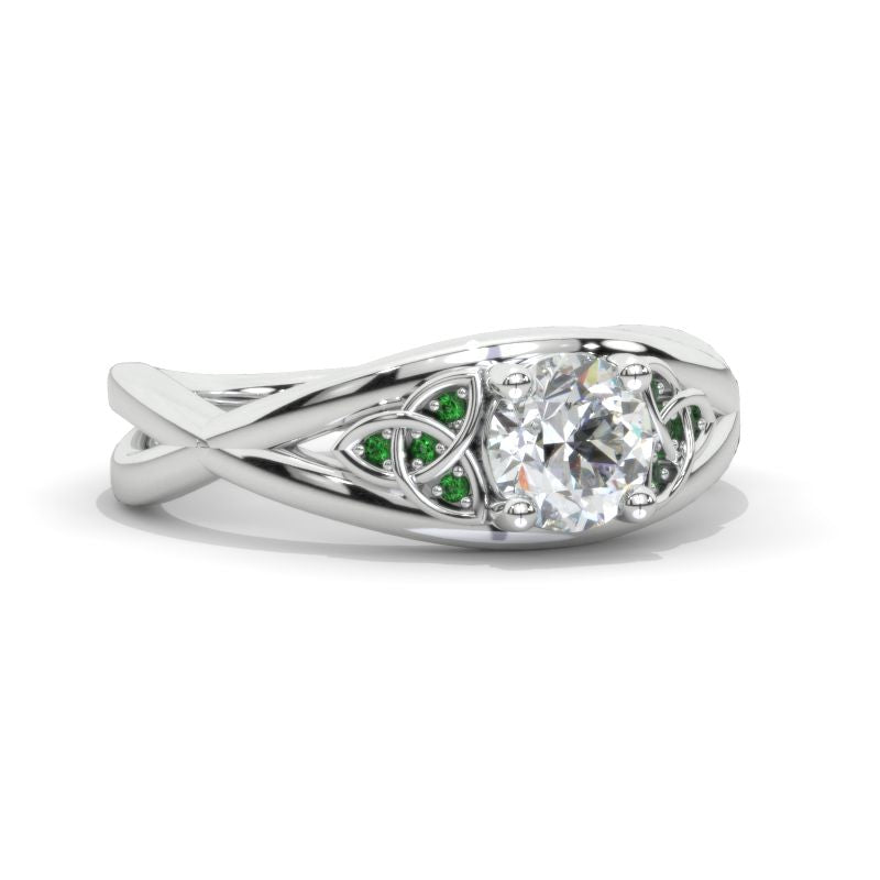 On the image featured Celtic Round LAB-Grown Diamond 6mm D-Colorless, VVS1-Clarity, VG-Symmetry with-0.1 CTW accent stones 14K White Gold Ring. Please remember that you can customize any design with your choice of metals and stones.
