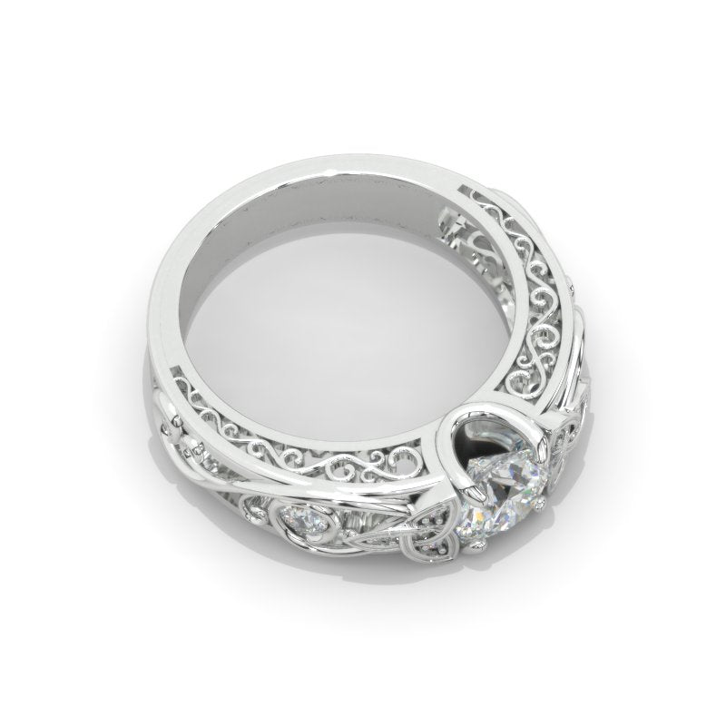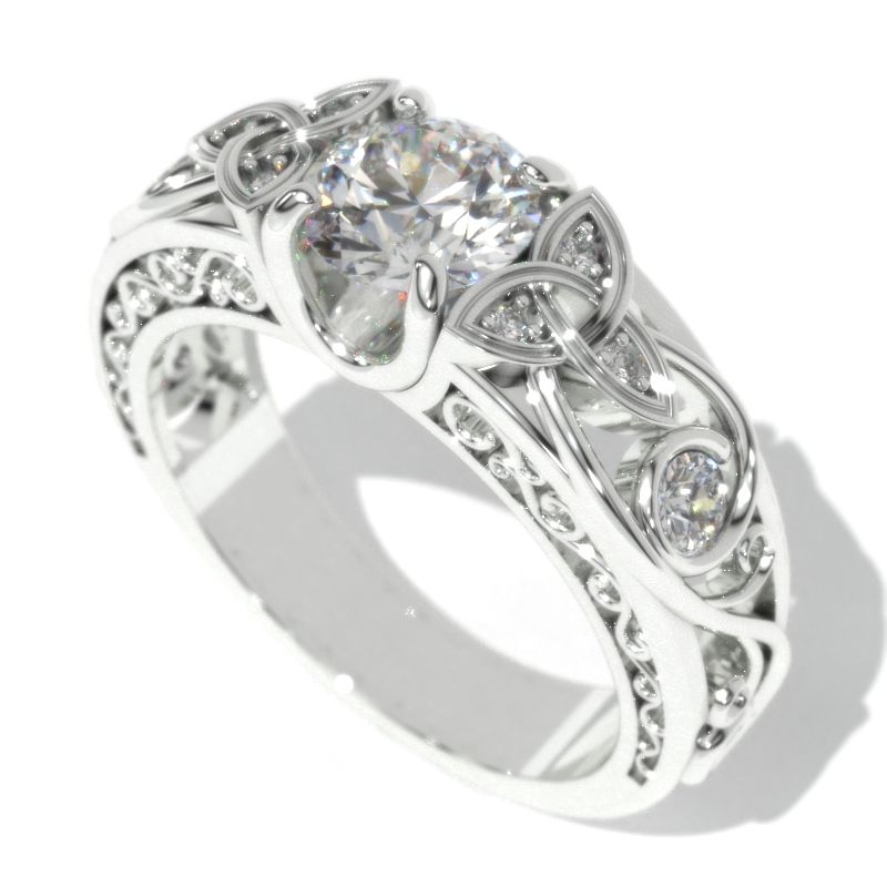 On the image featured Celtic Round LAB-Grown Diamond 6mm D-Colorless, VVS1-Clarity, VG-Symmetry with 10 - Approximately 0.25+ CTW D-Colorless, VVS1 clarity accent stones 14K White Gold Ring. Please remember that you can customize any design with your choice of metals and stones.