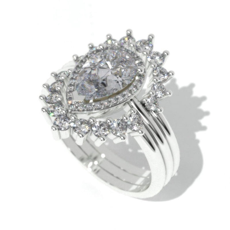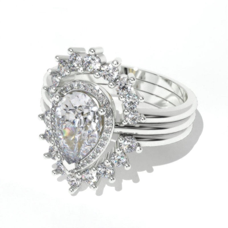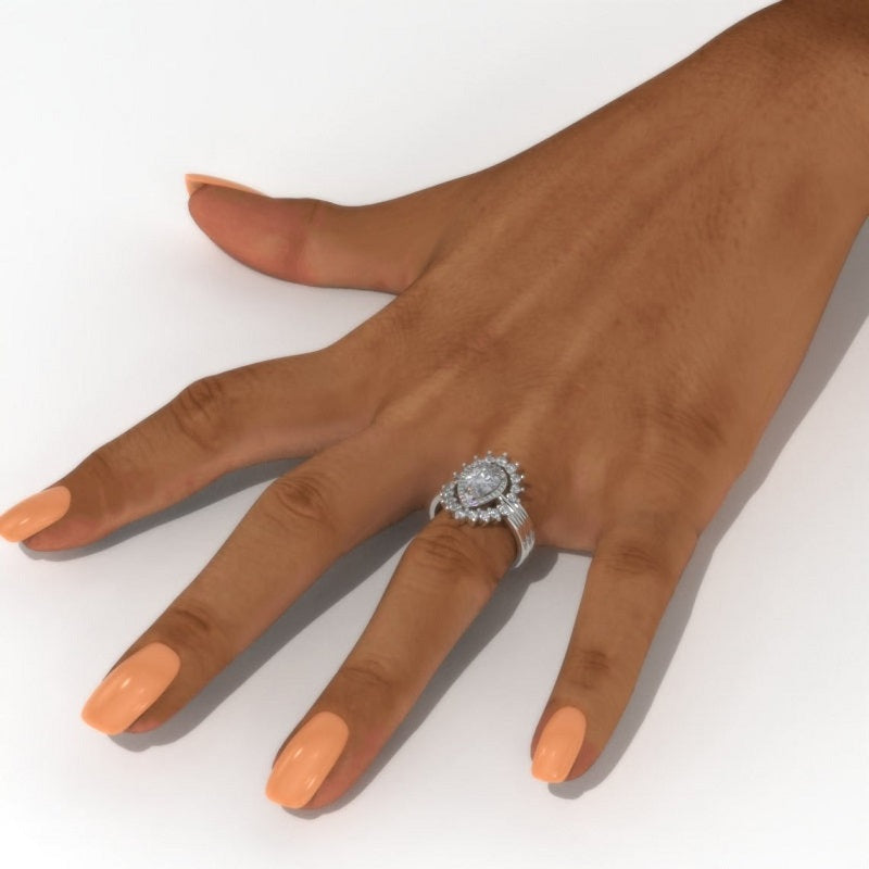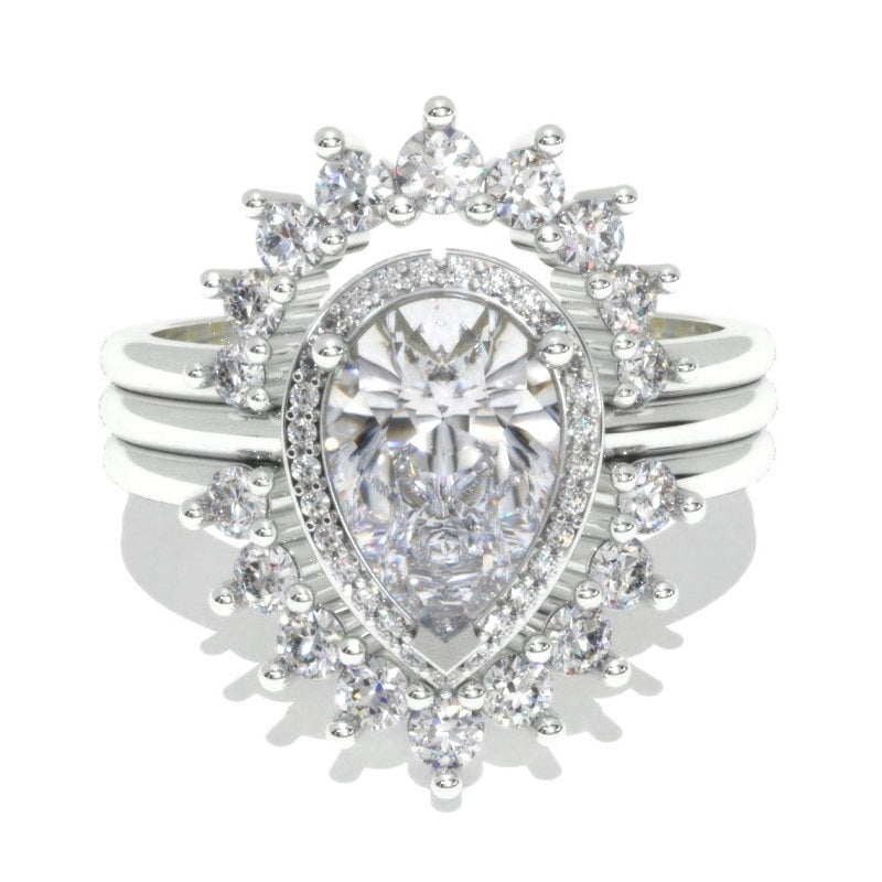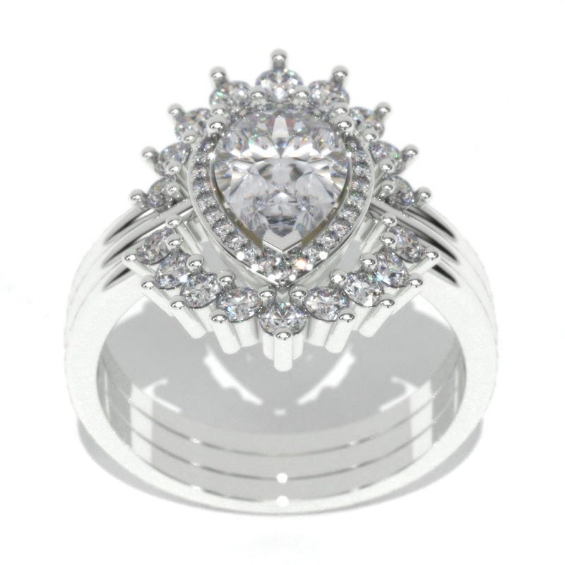 The default design option features Approximately 1.5+ Carat 8x6mm Pear Center LAB-Grown Diamond VVS1-Clarity, VG-Cut, Ex-Polish, VG-Symmetry set with D- Colorless LAB-Grown Diamond Accent StonesĀ