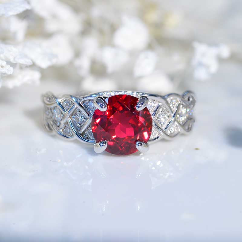 This one of a kind ring features beautiful lattice design which embeds gorgeous jewels of your choice and elegantly twists into the main center stone.