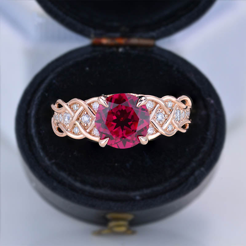 The default design option features 2 Carat Round 8mm Ethically Lab-Grown AAA - Grade Ruby Engagement Ring with 24 - 0.2 CTW Moissanite Accent Stones 14K Rose Gold Ring.