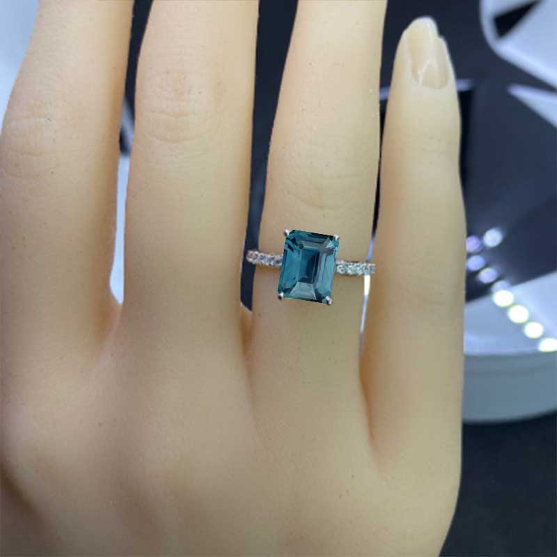 The design features approximately 3 Carat Ethically Lab-Grown Teal Sapphire - Emerald 9x7mm