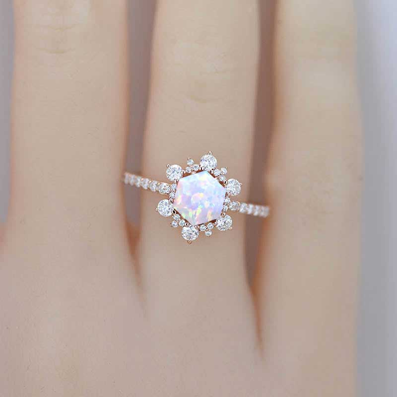 The default design option features 8mm Hexagonal Ethically Lab-Grown Genuine White Opal, VVS1 - Clarity, VG-Cut, Ex-Polish, VG-Symmetry with D - Colorless Moissanite Accents