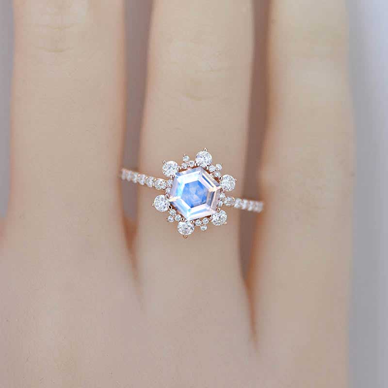 Luxury 3 Carat Hexagonal Natural Moonstone Snowflake Halo Engagement R - Giliarto