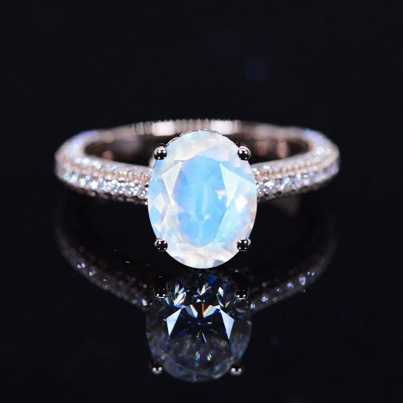 Luxury 3 Carat Oval Genuine Moonstone Hidden Halo Gold Rose Engagement Ring