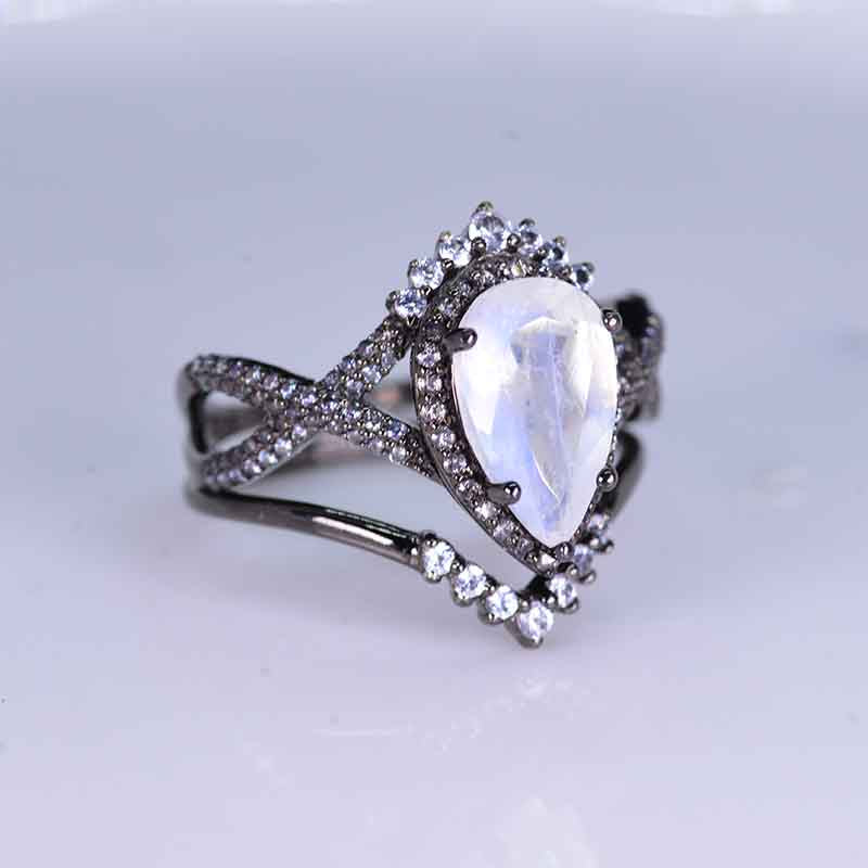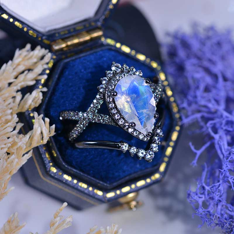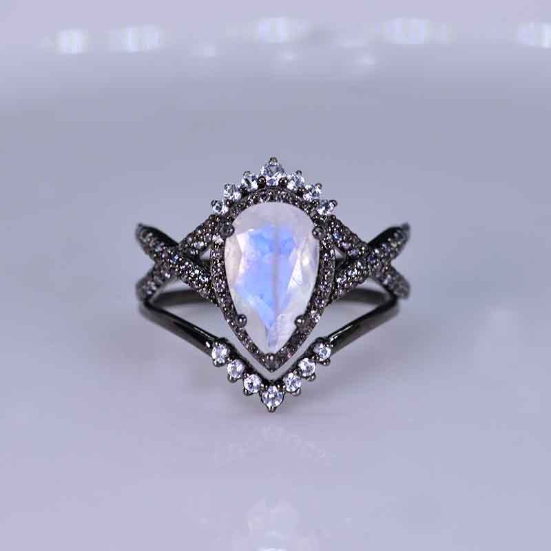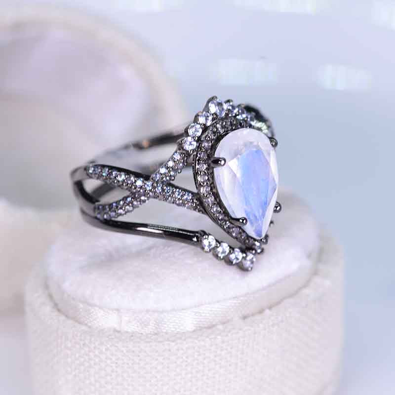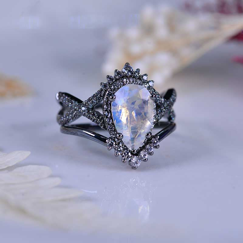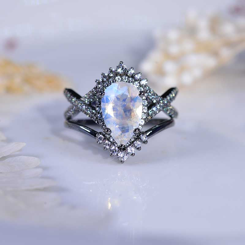 Luxury Natural Moonstone Ring Set, 3ct Pear Cut Moonstone Ring Set, Bl - Giliarto