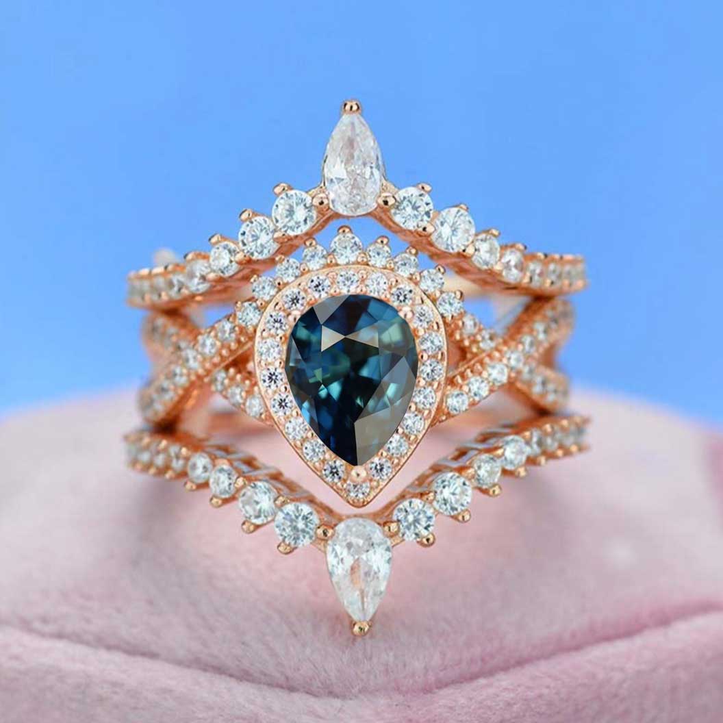 Luxury Teal Sapphire Ring Set, 2ct Pear Cut Teal Sapphire Ring Set, Ro - Giliarto