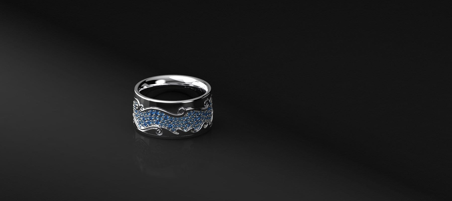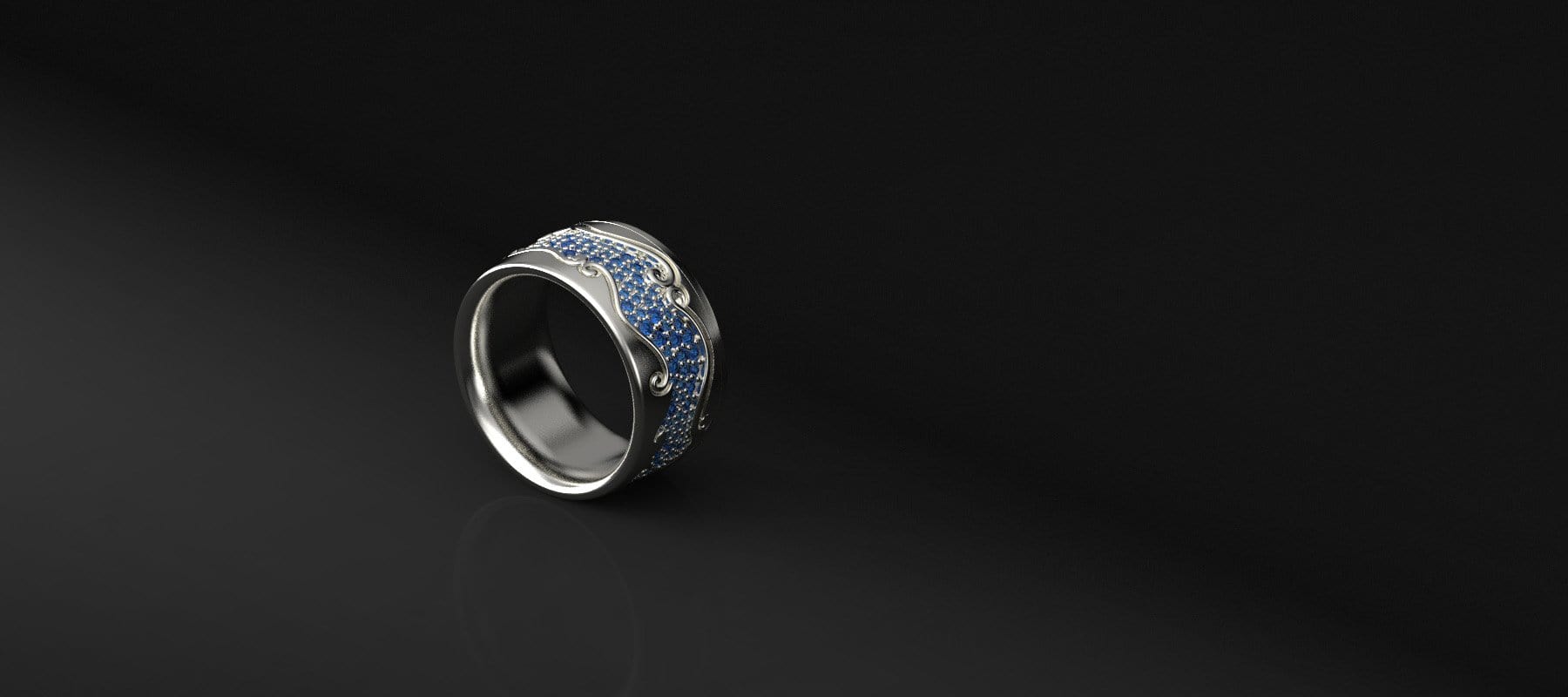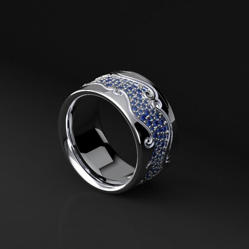 Men's Ring with Blue Sapphire Stones 14K White Gold Ring