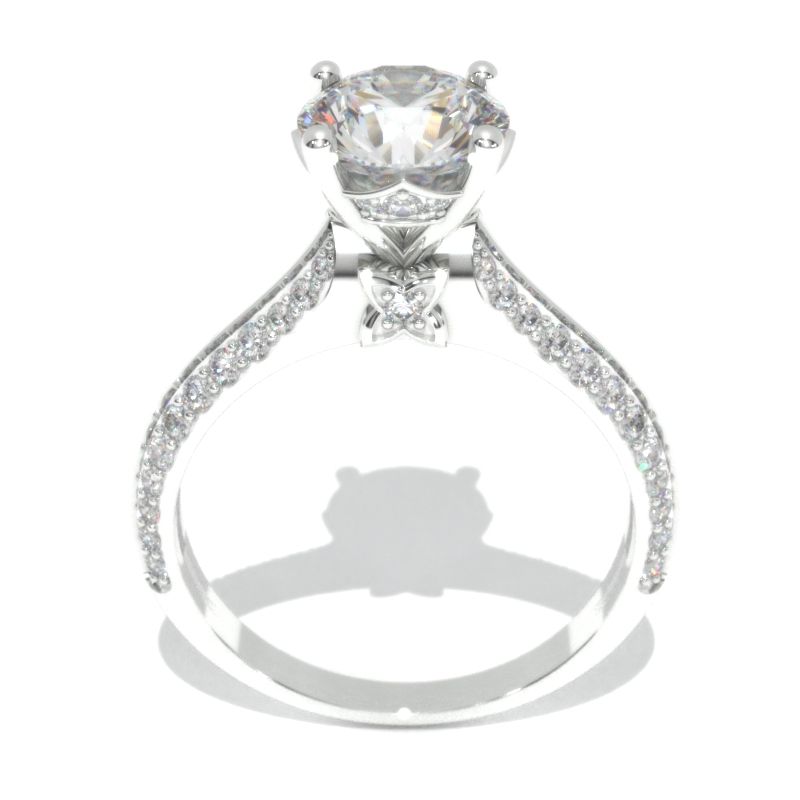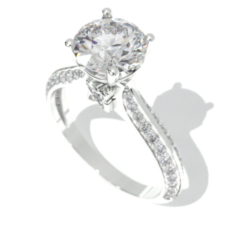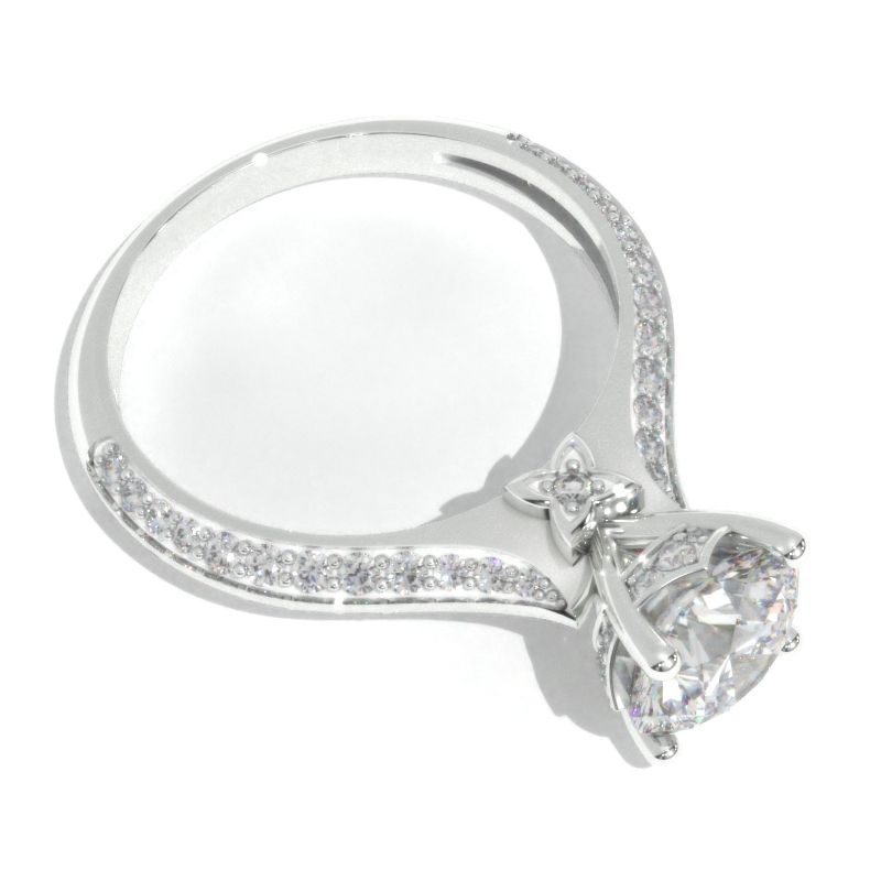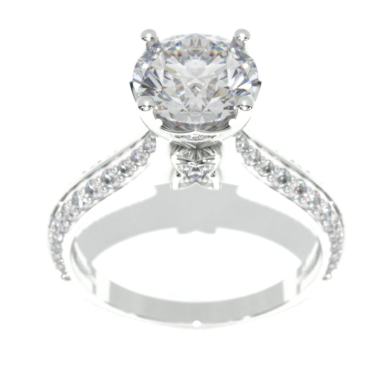 2.0 carat Giliarto moissanite center stone (round 8 mm, H-Color, I2-Clarity, Ex-Cut, Ex-Polish, VG-Symmetry) and 64  accent stones  ( 0.5 CTW G-H color,  I1 clarity) with  14K white gold.