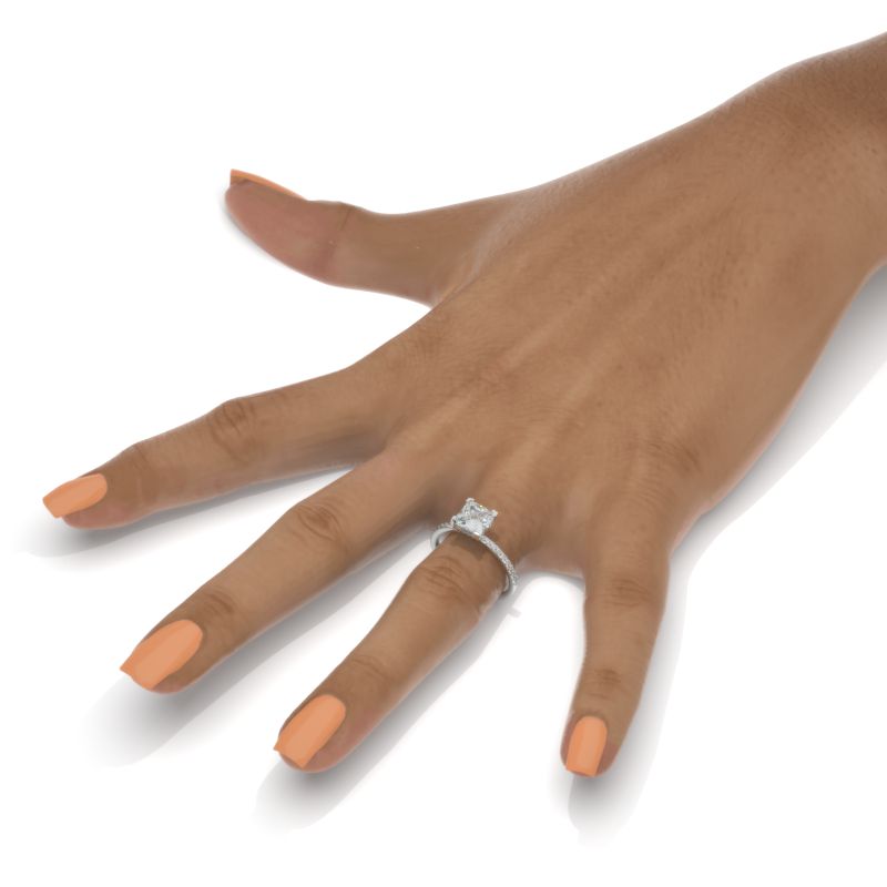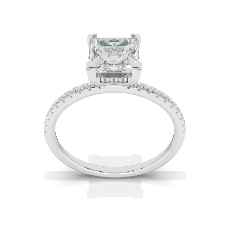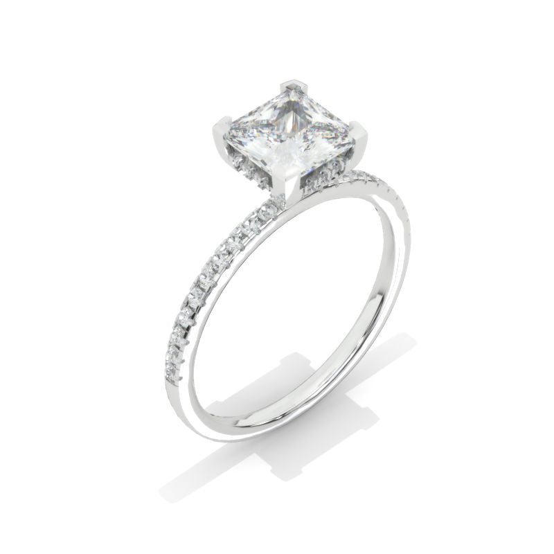 The default design option features 6.5mm Princess Cut Giliarto Moissanite Center Stone D-Colorless VVS1-Clarity, VG-Cut, Ex-Polish, VG-Symmetry set with D- Colorless Moissanite Accent Stones in 14K White Gold Engagement Ring.Â