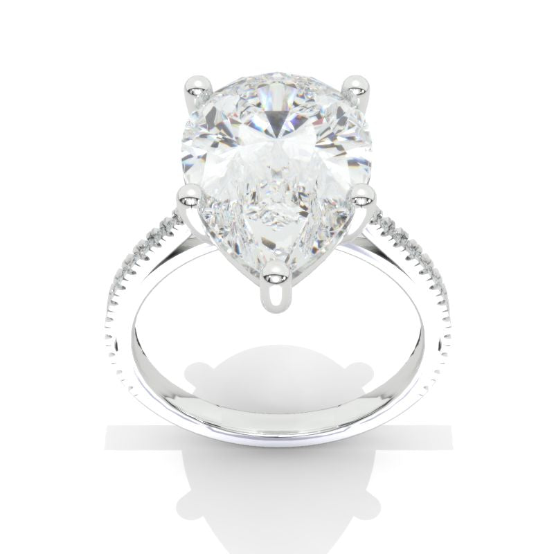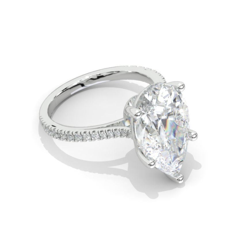 The default design option features Pear Cut 16x10mm Giliarto Moissanite-Center Stone D-Colorless, VVS1-Clarity, VG-Cut, Ex-Polish, VG-Symmetry, Set with Colorless Moissanite Accent stones in 14K White Gold Engagement Ring.Â