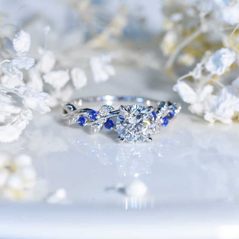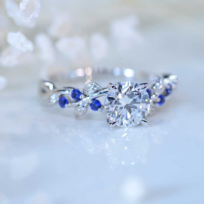 Moissanite Sapphire Floral 14K White Gold Engagement Ring Model 446-7 - Giliarto