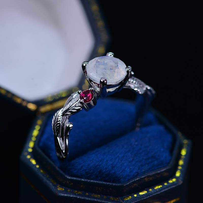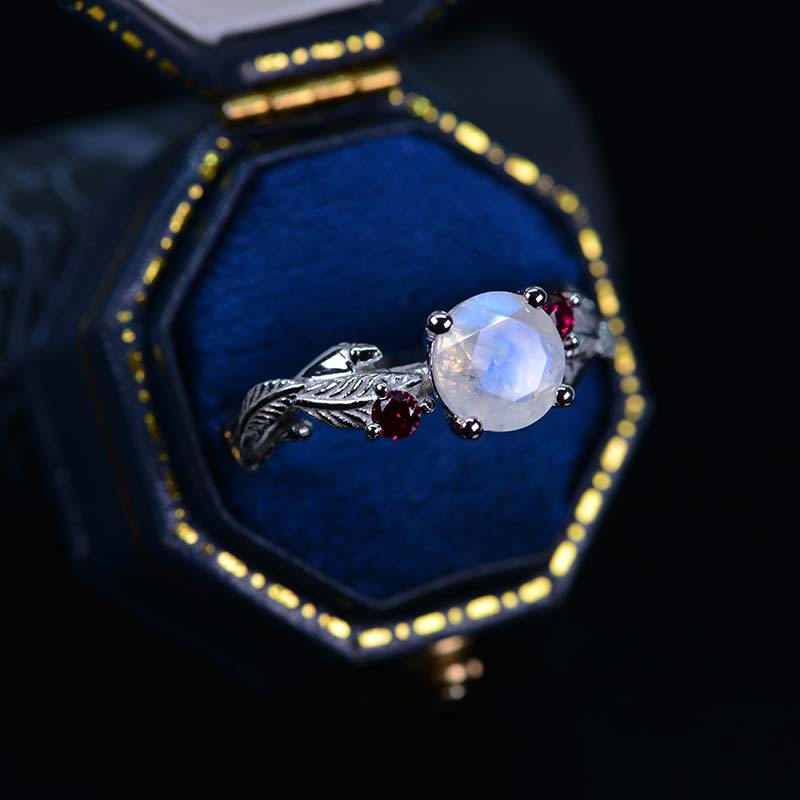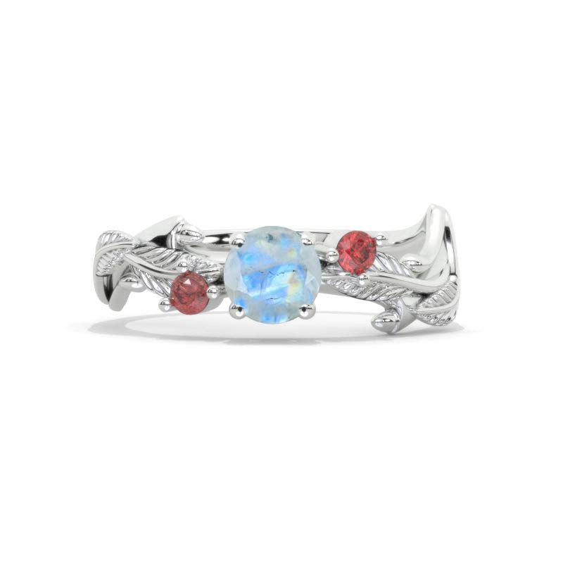 Moonstone White Gold Floral Engagement Leaves Ring - Giliarto