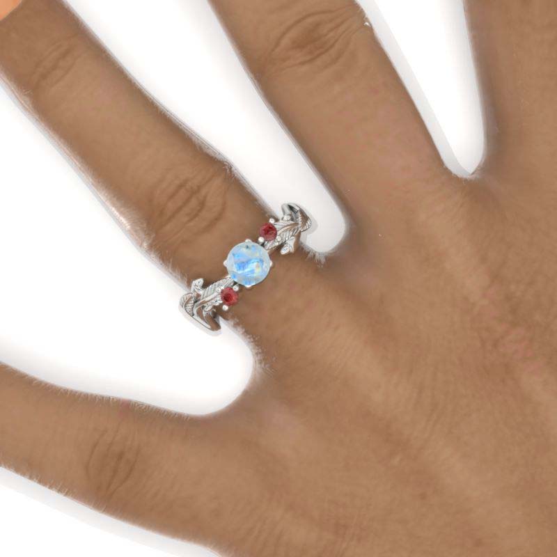 7mm Round Moonstone Center Stones  Shape: Round, VG-Symmetry set with Ruby Accents Stones in 14K White Gold.