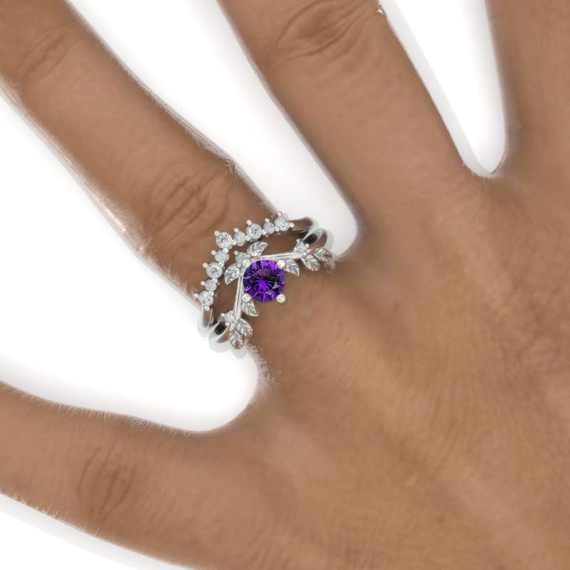 Natural Amethyst Floral Halo 14K White Gold Engagement Ring Set