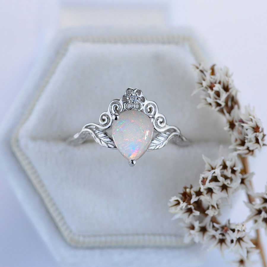 Natural Genuine White Opal Pear Shape Floral Gold Ring - Giliarto